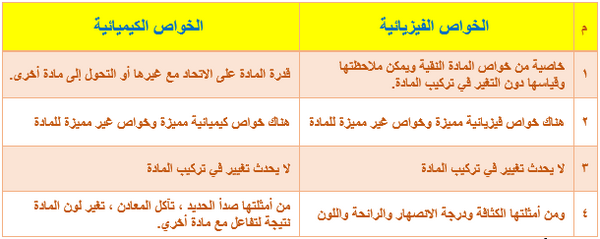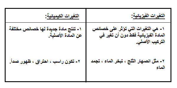 جدول مقارنة بين التغيرات الفيزيائية والكيميائية المرسال