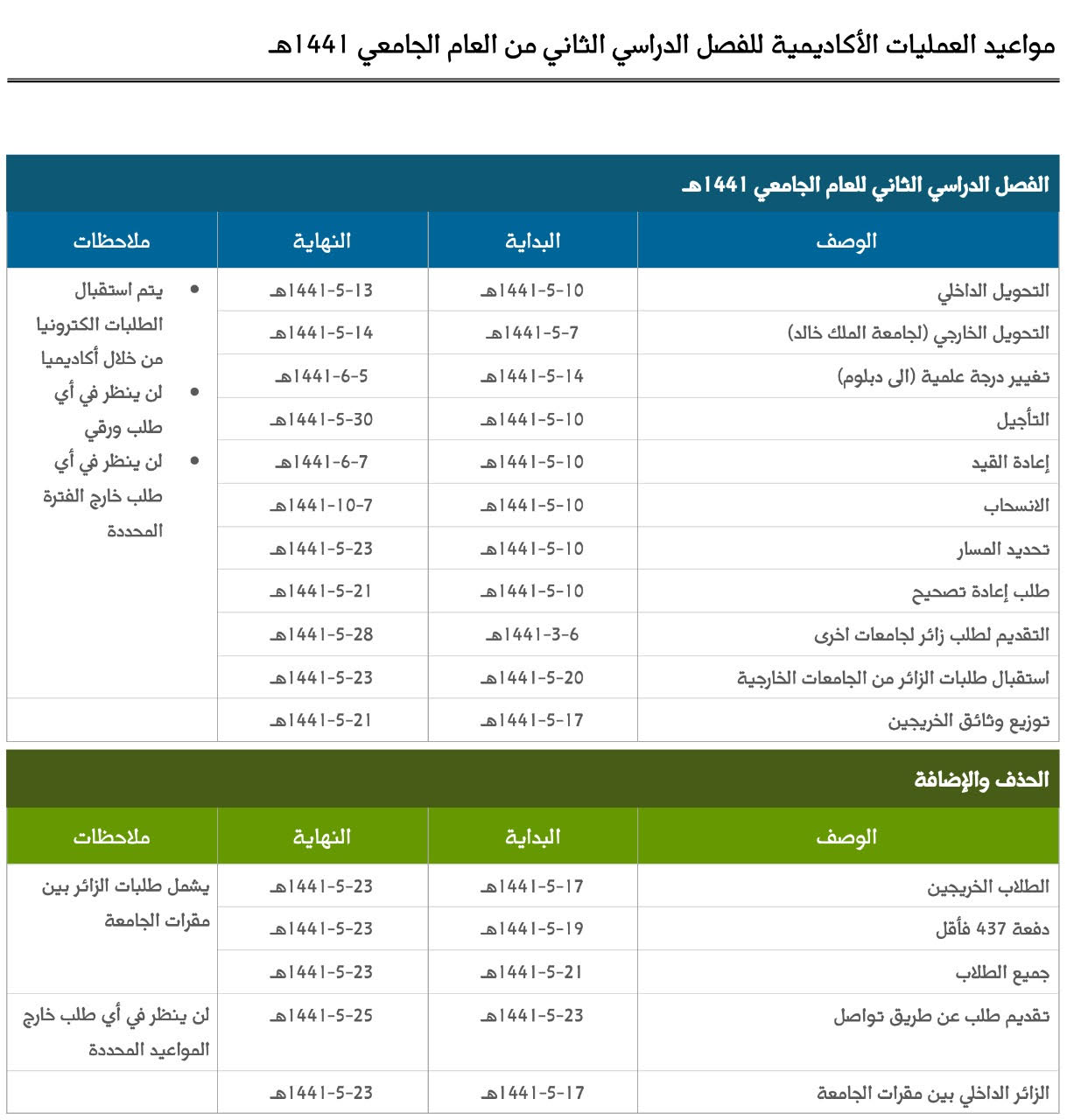 جامعة الملك خالد On Twitter حددت عمادة القبول والتسجيل بـ جامعة الملك خالد مواعيد العمليات الأكاديمية للفصل الدراسي الثاني من العام الجامعي 1441هـ Https T Co Owcbgorqrz